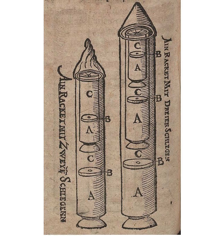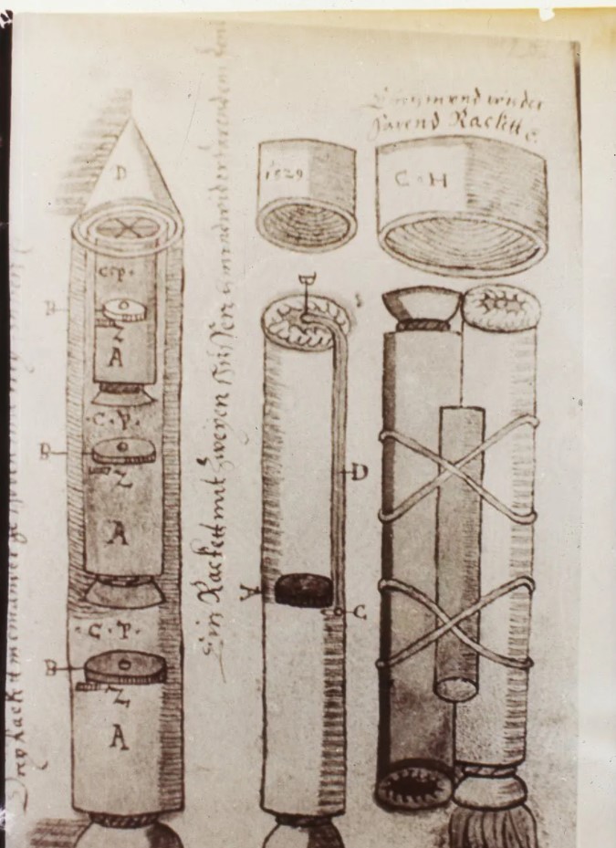 Lo que sí es seguro es que Johann Schmidlap, un alemán que fabricaba fuegos artificiales, fue el primero en experimentar con cohetes. Lo hizo en 1590 con un tipo llamado cohetes de paso. Además publicó un libro sobre fuegos de artificio pues fue un pionero en el área.