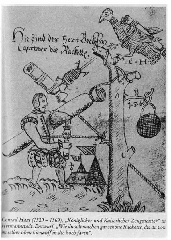 Conrad Haas escribió este peculiar manual entre 1550 y 1570. Haas era un ingeniero militar que trabajaba para el Reino de Hungría y fue el jefe de arsenal del Imperio Austriaco, durante el reinado de Fernando I. Sus aportaciones a la ciencia fueron importantes pues en su época ya había diseñado y descrito algo que la humanidad logró materializar 4 siglos después.