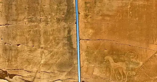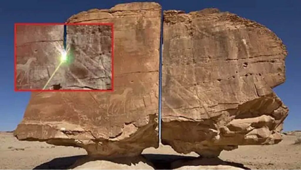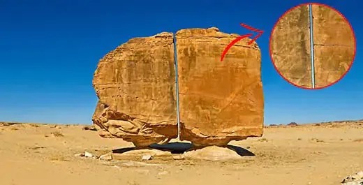 En Arabia Saudí se encuentra una misteriosa piedra que deja atónitos a miles de turistas desde hace más de un siglo. Hablamos de Al Naslaa, una formación rocosa de 9 metros aproximadamente de alto y 7.5 metros de ancho que se ubica en el oasis de Tayma. La roca está cubierta de pinturas rupestres y a primera vista podría parecer que no tiene nada de especial pero si la vemos desde la parte lateral, la roca tiene un corte totalmente perfecto que la divide en 2.
