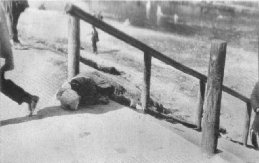 Hombre sin vida en una calle de Kharkiv, 1933.