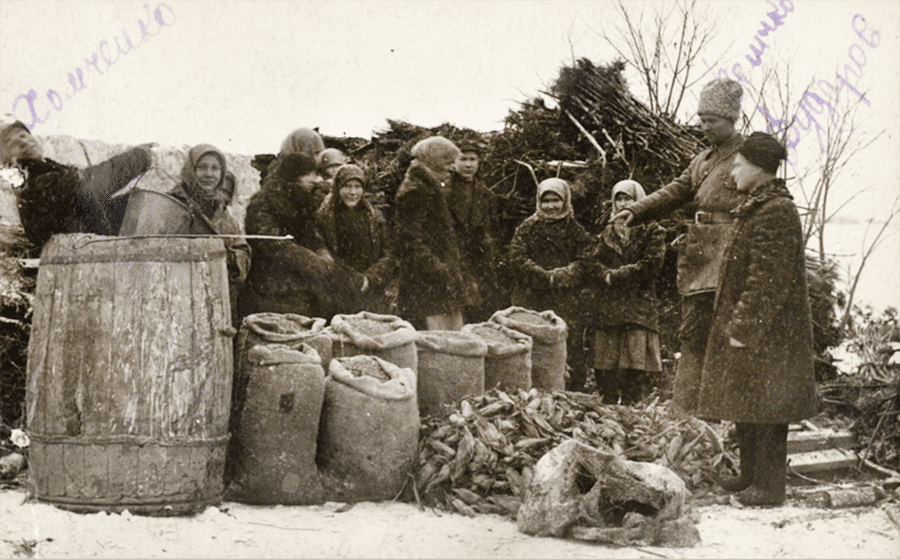 Granjeros recibiendo pequeñas porciones de alimento, Donetsk, 1933.