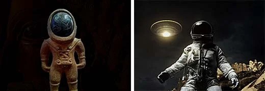 Analizando la imagen de la estatuilla de manera detallada, se puede apreciar que tiene un parecido increíble con los trajes que llevan los astronautas. La parte superior sería la representación de casco, en ella se observa el relieve de un humano de rodillas, sosteniendo una especie de tazón que contendría ofrendas. Justo en la parte izquierda, se puede ver lo que sería la representación de un platillo volador.